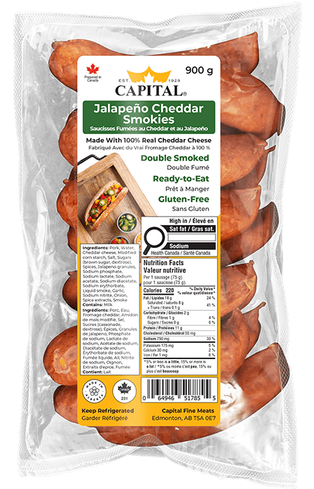 Made with blocks of real cheddar cheese and Jalapeño, we’ve achieved a balanced smokie that’s both spicy and flavourful. Our Capital® Jalapeño Cheddar smokies are perfect over a fire, or on the barbecue.